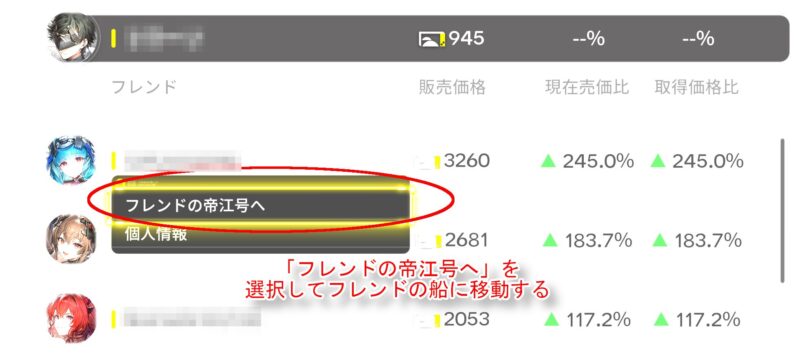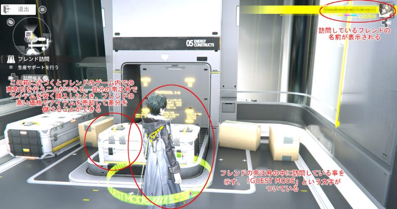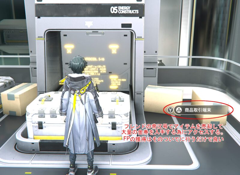 上のスクリーンショットまでの操作を行うと、下のスクリーンショットのようにフレンドの帝江号の中に移動することができます。この際、自分の帝江号の中で使った「商品取引端末」をフレンドの船の中でも利用でき、先ほど選んだ価格でアイテムを売却できますので、全て売却して谷地取引券をゲットしておいてください。売却の詳細はここでは省きます。