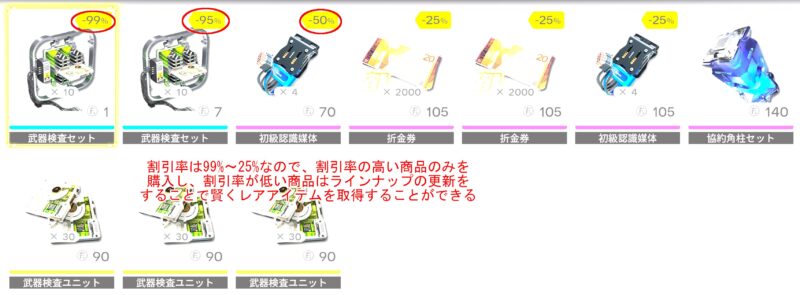 さて、武庫配給以外に魅力的なアイテムはあるのでしょうか?答えは「割引率によって激安なアイテムは全て買い」と筆者は思っています。下のスクリーンショットのように割引が最も高いものは「99%」という破格の値段で売り出されています。その隣も「95%」と非常に高い割引率です。これらのアイテムはFPの消費が全然少ないので迷わず買い占めておきましょう。