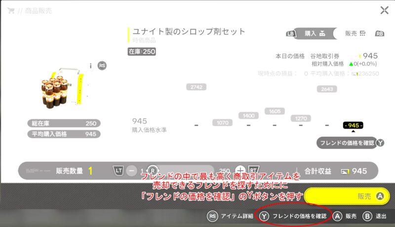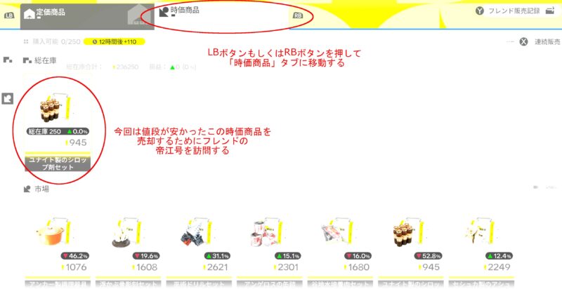 時価商品の購入が完了したら、その購入したアイテムをすぐに高く売却するためにフレンドの帝江号に移動して売却することにします。この際、最も高く買い取ってくれるフレンドを探すため、下のスクリーンショットにある「フレンドの価格を確認」のYボタンを押します。