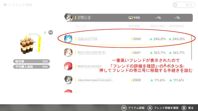 Yボタンを押すと事によって一番価格の高いフレンドから価格の安いフレンドへの降順で表示されます。今回で一番高い値段で売却できる方は3,260ポイントのようなので、この方を選択して「フレンドの詳細を確認」のAボタンを押します。