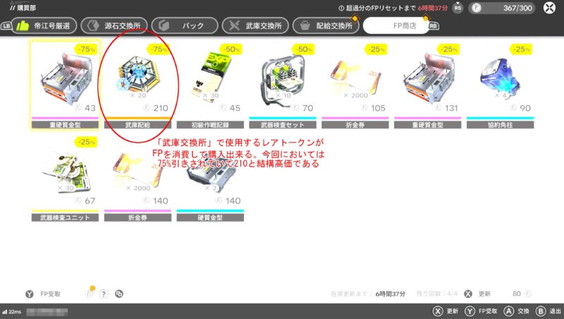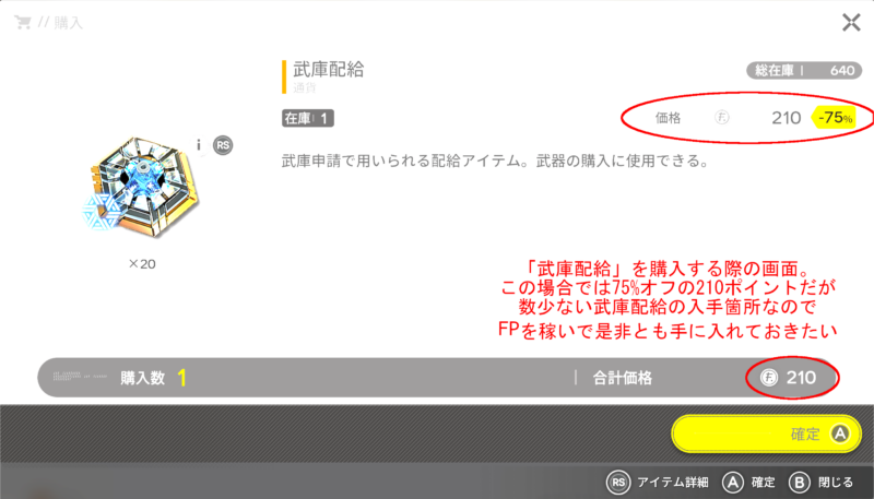 上のスクリーンショットであえて赤丸を付けさせていただきましたが「武器交換所」で好きな武器と交換できるトークンである「武庫配給」をFPで購入する事が可能なのです。値段は決して安くない(75%割引で210、50%割引だと420)商品でありますが、このFP以外で武庫配給を手に入れるルートはほとんどないので大変重宝するものだと筆者は考えています。念のため、下に武庫配給についての詳細を表示させたスクリーンショットを貼っておきます。