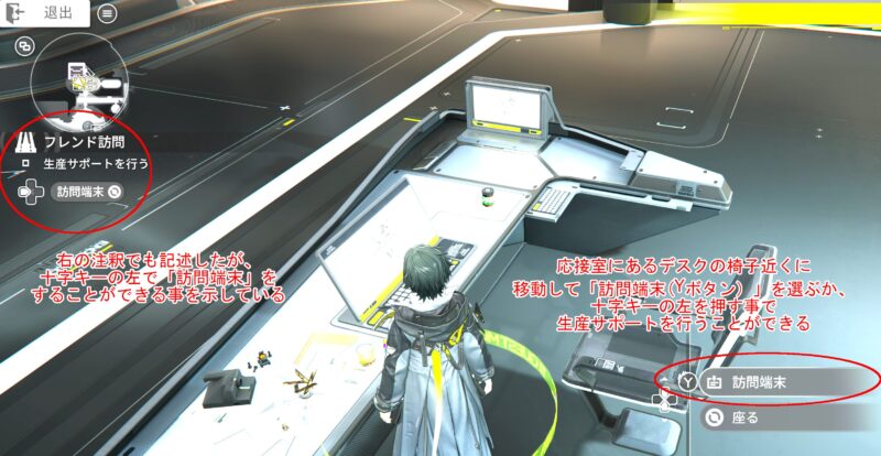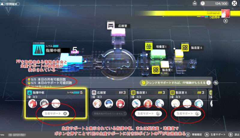 「訪問端末」へと移動すると、帝江号の指揮中枢や製造室、培養室のフレンドの状態が表示されます。この際、指揮中枢などのウィンドウに「生産サポート(A)」と書かれたボタンが表示されますので、ここでAボタンを各施設で押す事により、一回あたりFPを20獲得することができます。