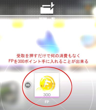上のスクリーンショットの注釈に書いてありますが画面左下にて「FP受取」というボタンにオレンジ色がついていることが分かります。ここで対象ボタンであるYボタンを押すことで300ポイントのFPを無条件で何の消費もなく受け取ることが出来ます。その受け取った結果が下のスクリーンショットです。