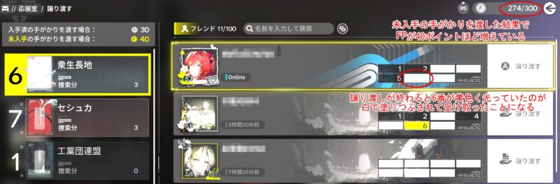- 応接室でフレンドに手がかりを譲り渡すと、1枚につきFPを30獲得します。相手の未所持の手がかりを渡すと、追加でFPを10獲得します(上限なし)。