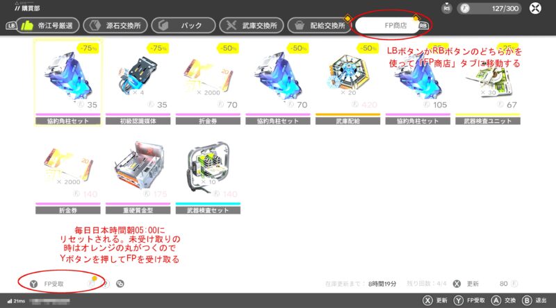 購買部のメニューに移動すると、FPに関わるものも含めて様々なアイテムの販売を行っている画面になります。ここではLBボタン、もしくはRBボタンのどちらかを使って「FP商店」というタブに画面を切り替えることによってFPの取得と交換を行う画面に遷移出来ます。
