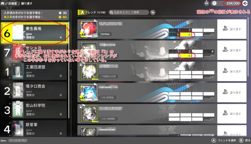 この手がかりの画面について説明すると、7種類の「手がかり」をオペレーターなどに捜索させ、7種類の手がかりを得る事で「情報共有会」というFPを更に獲得できる機能を働かせることができます。それ以外にフレンドから自分が持っていない手がかりを受け取ったり、またはフレンドが持っていない手がかりを渡す事でもFPを獲得することができます。