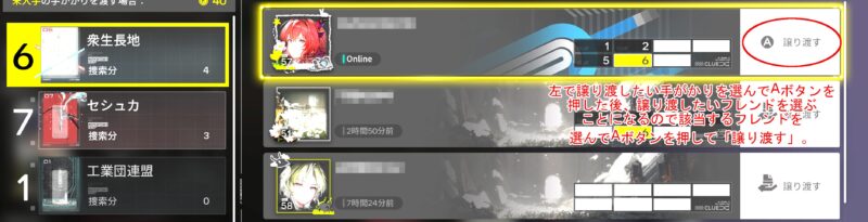 該当する手がかりでAボタンを押して選択が終わったら、次に該当する手がかりを持っていないフレンドを選択します。一番上にリストアップされている人に自動的にフォーカスが移りますので、譲り渡して問題ないなら「譲り渡す」のAボタンを押して確定しましょう。