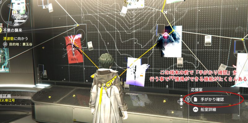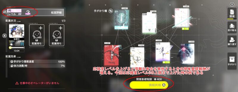 - 応接室の情報スペース解放後、オペレーターを配属して手がかりを捜索すると、手がかり1枚につきFP20獲得できます(上限なし)。