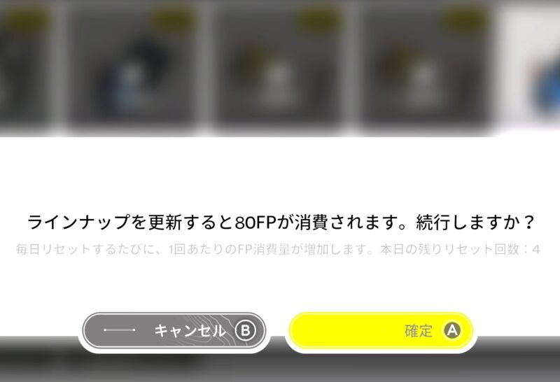 上記のスクリーンショットのような激安なアイテムがあまりなかった場合はどうすべきでしょうか?定価で売っている商品を購入するのも一つの手段ですが、筆者としては割引率が低いか定価である商品ばかりになってしまったときは「更新」をしてみることをお勧めします。一回目のラインナップ更新でFPを80消費しますが、既に購入済みであるアイテムも含めて全て一新して表示してくれます。その中には割引率の高い商品がまた並びますので、これによって安く賢くFPを消費することが可能です。FP商店のメニューが表示されているとき、Xボタンを押すことで「更新」をするかどうか確認してきます。