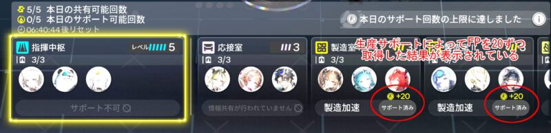 下のスクリーンショットは生産サポートを全て使い切った後の画面です。画面右側の2つの項目を見ると「サポート済み」と書かれたボタンの上に「F+20」という記述があることが分かります。これが今回のお目当てであるFPを獲得した証拠です。なお「製造加速」という文字がボタンの左に書かれていますが、この生産サポートを受けたフレンドは、その施設でのアイテム作成の時間短縮の恩恵を受けるようです。実際にどれぐらいの恩恵があるのか、また指揮中枢、製造室、培養室でどう効果が異なるのかは調べられませんでした。ただ、サポートを受けた相手も得をすることだけは間違いありません。