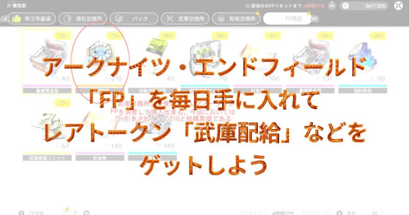 その無課金で遊ぶ事を前提とした時、是非毎日の日課として行っていただきたい行動が「FP」というトークンの入手です。そのトークンによって購入出来るアイテムがいくつかあるのですが、特に「武庫配給」というトークンはその名の示すとおりオペレーターの武器を購入するために必須のトークンです。毎日手に入る訳ではありませんが毎日の積み重ねを続ければ良い武器を購入することも可能となります。そこで今回はこの「FP」というポイントがどのように入手できるか、またどのように消費すべきかを深掘りしていきたいと思います。