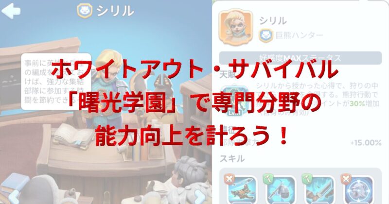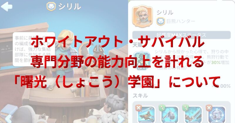 サーバが運営されながら様々な新機能が追加されていくホワイトアウト・サバイバル。今回は特定の通常イベントや都市機能についてのニッチな部分について強化していく研究施設で「曙光(しょこう)学園」が追加されました。この新たな施設は複数のステータスが絡み合ってレベルアップをしていくもので、獣檻のようなレベルアップに加え、科学研究所のような仕組みもあってスキルなどのレベルアップをしていくには少々ややこしい部分があります。ですが、専門家と呼ばれるキャラクターのもつスキルをレベル上げすることができれば、頻繁に行っている特定のイベントで大きな恩恵を受けることが可能です。そこで、筆者が現時点までで分かっている曙光学園の仕組みについて解説いたします。