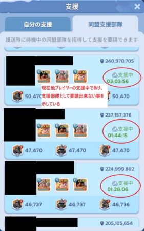 なおこの「支援部隊」の機能は1日1回までしか使えません。また、下記のスクリーンショットでも示していますが、先に他プレイヤーの支援を受けてしまった支援者たちは、護送が完了するまで他の支援を行う事が出来ませんので、どうしても支援を要請したい場合は先に支援を要請した人の終了時間まで待つ必要があります。