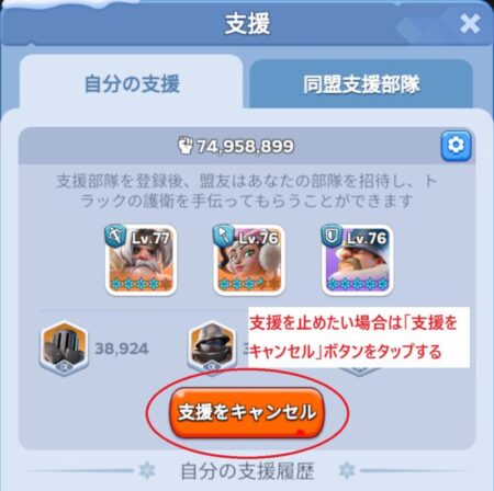 ここまで護送と略奪について紹介してきましたが、護送の方には少し特別な機能があります。それが「支援部隊」という機能です。筆者のメインもサブもですが、課金を多く行って強くなったプレイヤーにはやはりトラックを略奪されてしまいます。その為、少しでも略奪されるのを防ぐために自分よりも強い同盟プレイヤーの支援を借りることが出来るのがこの機能になります。