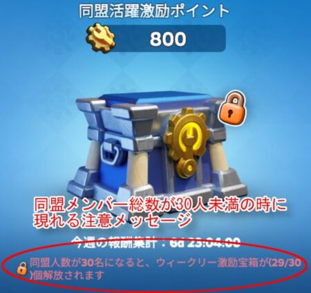 なお、注意点です。この「週間集計」の機能には同盟メンバーの総数の制限がある模様です。下にスクリーンショットを貼りましたが、同盟メンバーの総数が30人以上でなければ「週間集計」機能は使えない模様です。メンバーが30人未満の同盟を運営する方は、この機能を使いたいならば同盟メンバーを集める努力が必要でしょう。