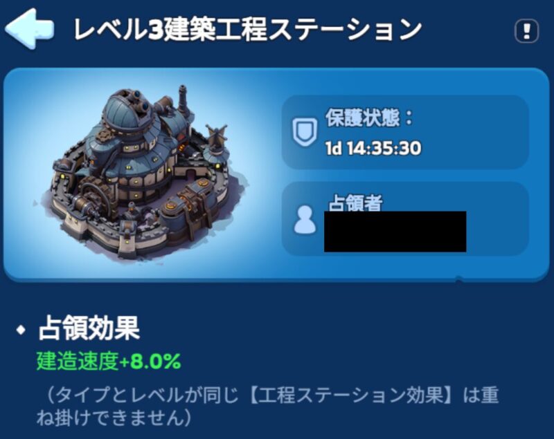 レベル1建築工程ステーションと重複して効果を得ることができるステーションです。建造速度が8%もあると、建造物の建築速度がかなり上昇します。大溶鉱炉レベルが20以上の人が多い同盟では特に役立つと思われます。