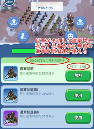 - 占領済みの建築物に派兵する為にチャージ型の「進軍加速」が無料で使える